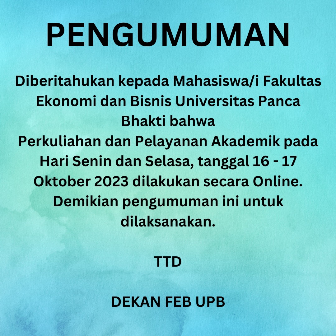 PENGUMUMAN KEPADA MAHSISWA/i FEB PERKULIHAAN DAN PELAYANAN DILAKSANAKAN SECARA ONLINE PADA TANGGAL 16 – 17 OKTOBER 2023 by Administrator FEB | Oct 15, 2023 | Informasi, Pengumuman